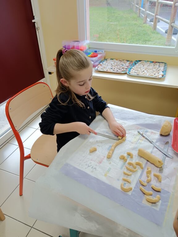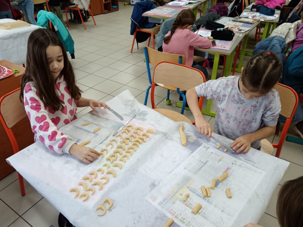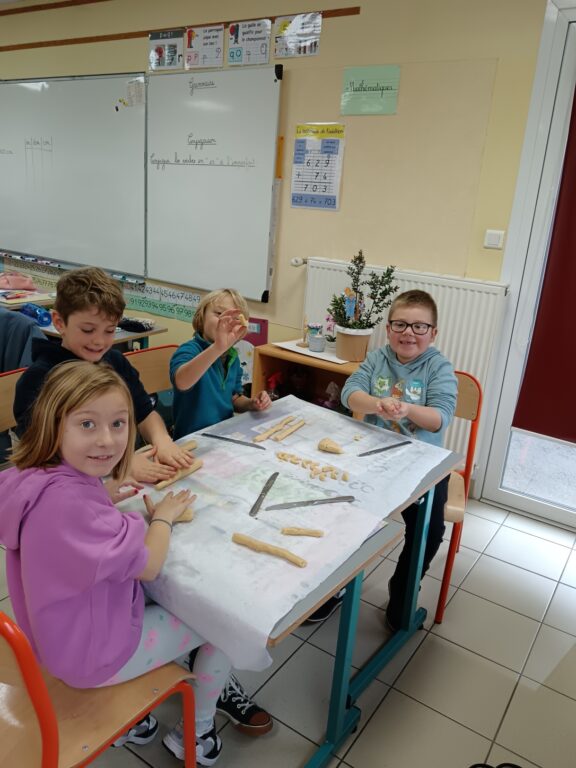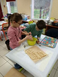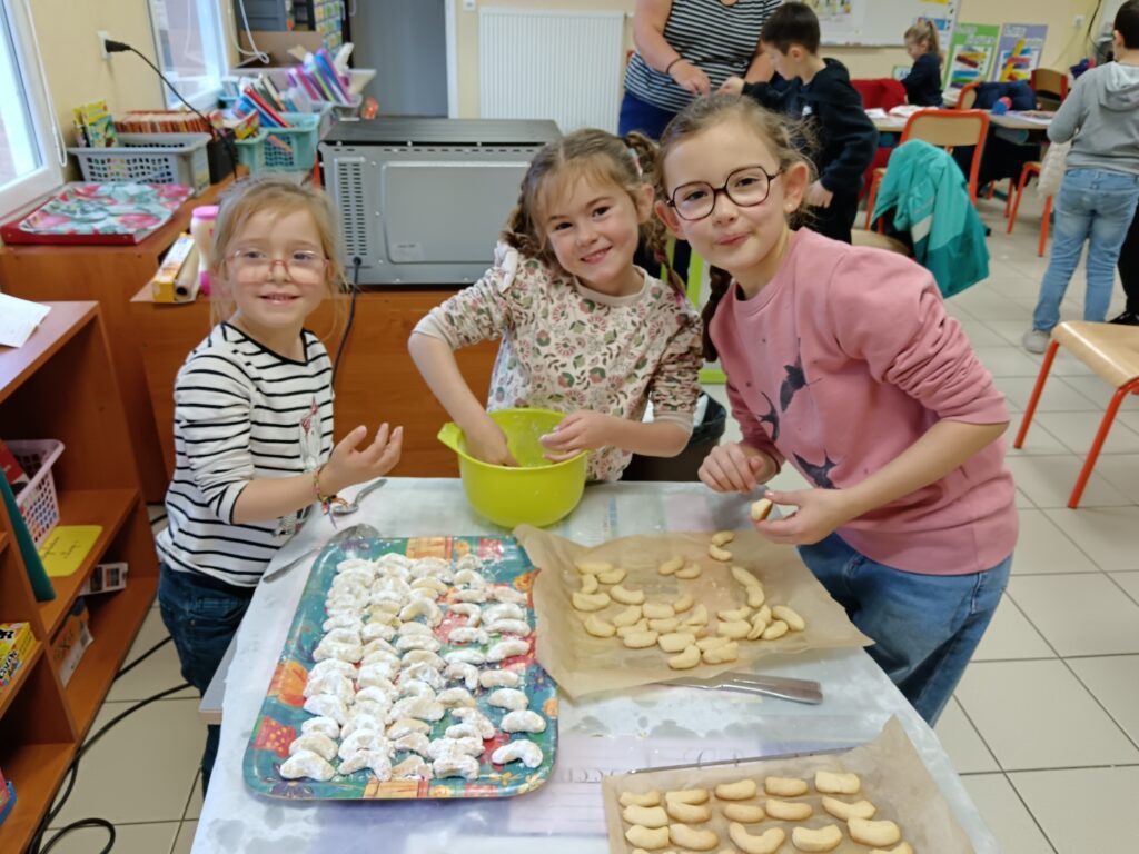 Le jeudi 4 décembre, la classe a ensuite vécu un moment particulièrement gourmand : les enfants ont cuisiné de délicieux petits gâteaux alsaciens, les fameux Kipferls. Guidés par l’enseignant, ils ont mesuré, mélangé, façonné la pâte puis roulé les biscuits encore tièdes dans le sucre vanillé.