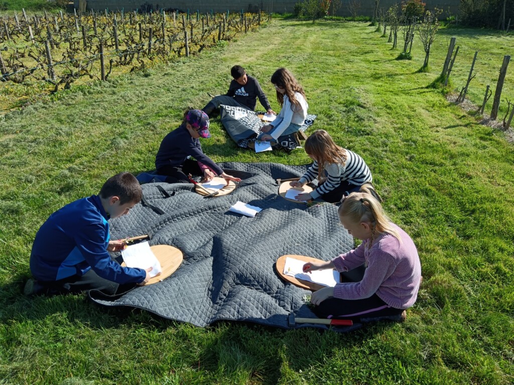Enfin, lors du dernier atelier, les élèves ont réalisé des empreintes végétales. Pour cela, ils ont cueilli des plantes, des herbes et des fleurs, qu’ils ont ensuite disposées dans un tissu. À l’aide d’un marteau, ils ont frappé délicatement le tissu afin de libérer les pigments naturels des végétaux, laissant apparaître de jolies empreintes colorées.