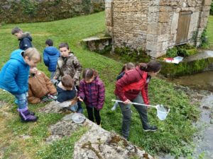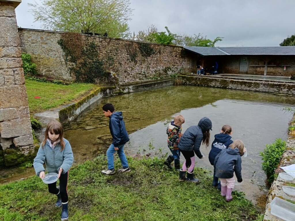 Le premier atelier était consacré à l’observation et à la découverte des petites bêtes aquatiques. Munis d’épuisettes, les élèves ont râclé délicatement le fond du lavoir pour y récolter des espèces vivantes. Dans un second temps, ils ont pris le temps d’observer leurs trouvailles et, grâce à des guides d’identification, ont appris à reconnaître et nommer les différentes espèces rencontrées.